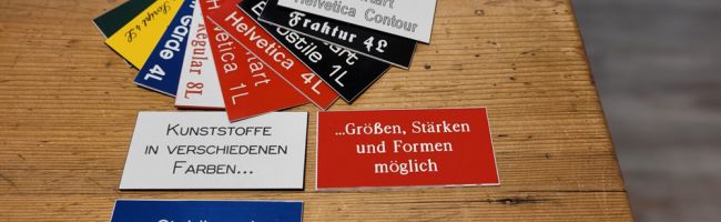 Wählen Sie selber Material, Farbe u. Schrifttyp. Wir beraten Sie natürlich gerne und stehen Ihnen mit Rat und Tat zur Seite.